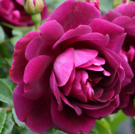 Roter Drache  (Kordes, 2012) Описание сорта: Роза с цветками насыщенного сливового, почти фиолетового, цвета, и более светлой обратной стороной лепестков. Цветок махровый (до 40 лепестков), с ароматом мёда и нотками гвоздики. Куст высотой 75-90 см, шириной 80-100 см, с прочными побегами почти без шипов. Листва средне-зелёная, глянцевая, с высокой устойчивостью к болезням.).
